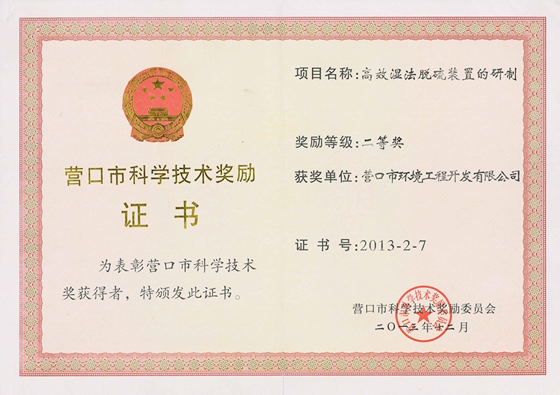 營口市科學(xué)技術(shù)獎(jiǎng)勵(lì)證書